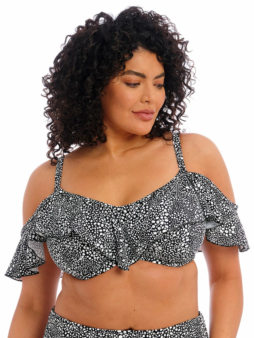Meet your new favourite swim top, the Elomi Pebble Cove Bikini Top. Featuring a ruffle detailing that can be worn on or off the shoulder, adjustable straps, and moulded cups – swimwear but with an Elomi bra fit.