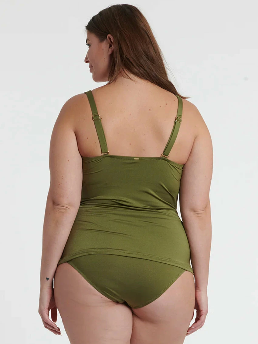 The Everyday Sunday Plus Size Tankini Top is perfect for those who prefer the look of a one piece but the function of a two piece. Made with a flattering wrap neckline, removable cups, and adjustable and convertible straps.
