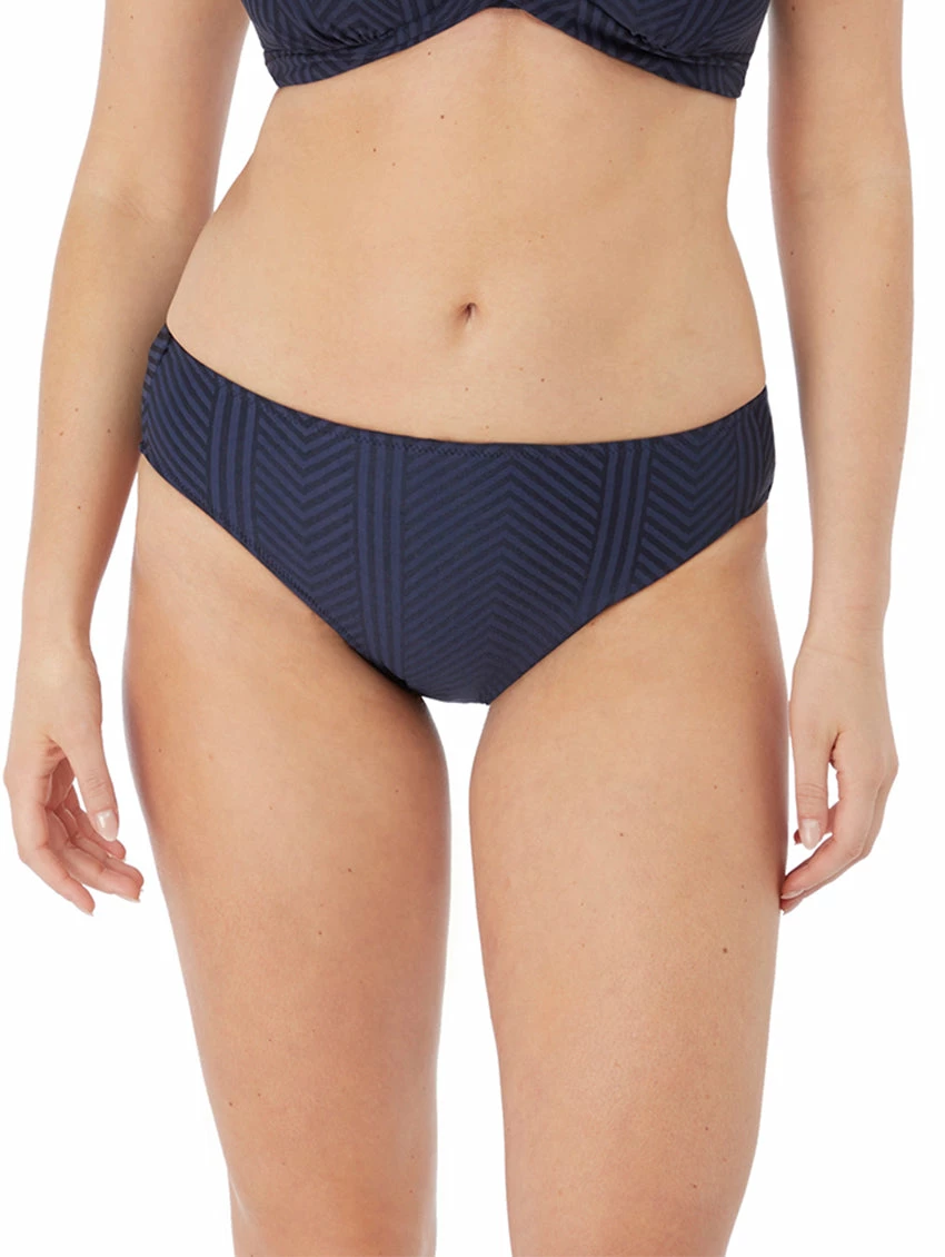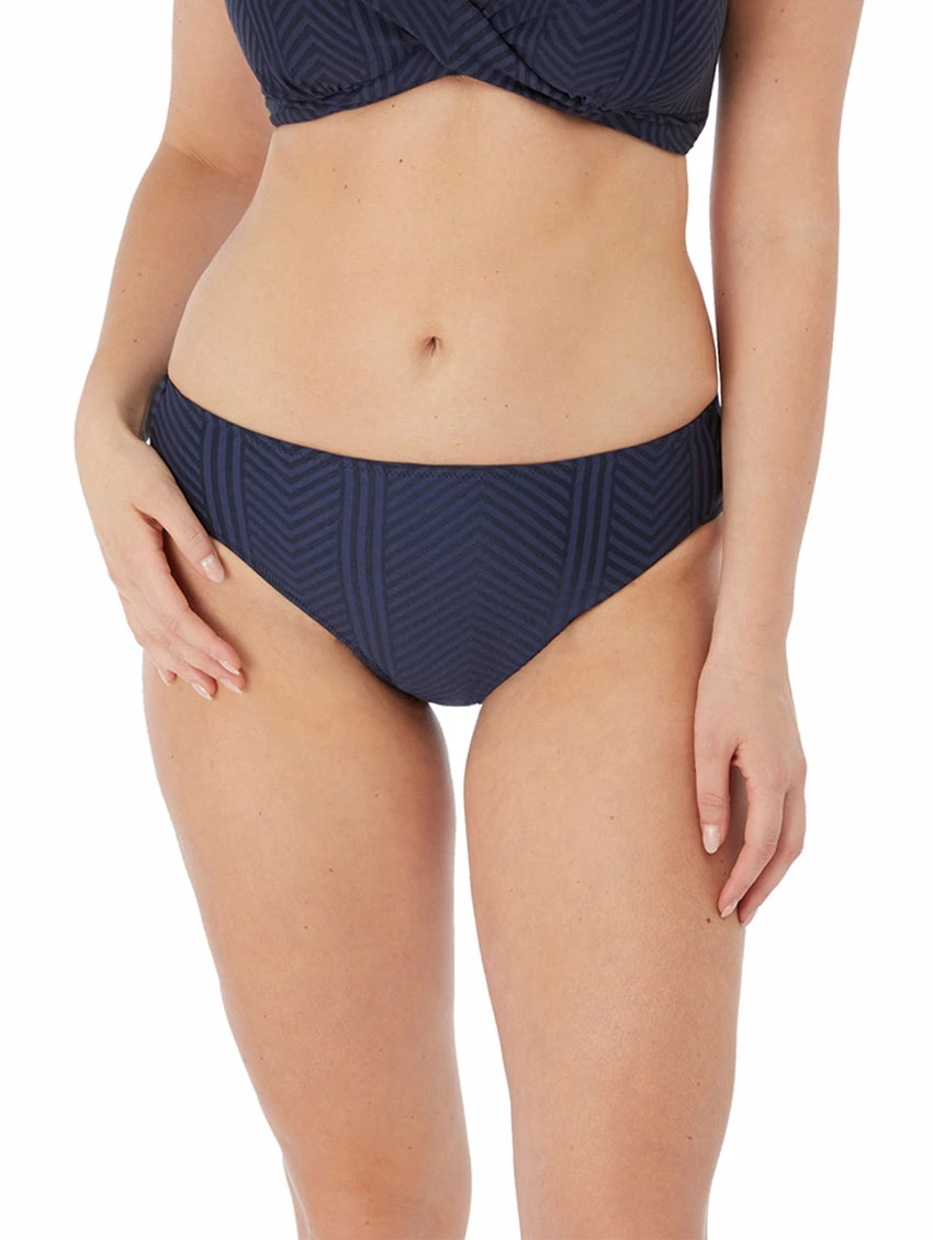 Fantasie’s Long Island Mid Rise Bikini Brief in Ink showcases a subtle chevron design on a classic Ink blue base.