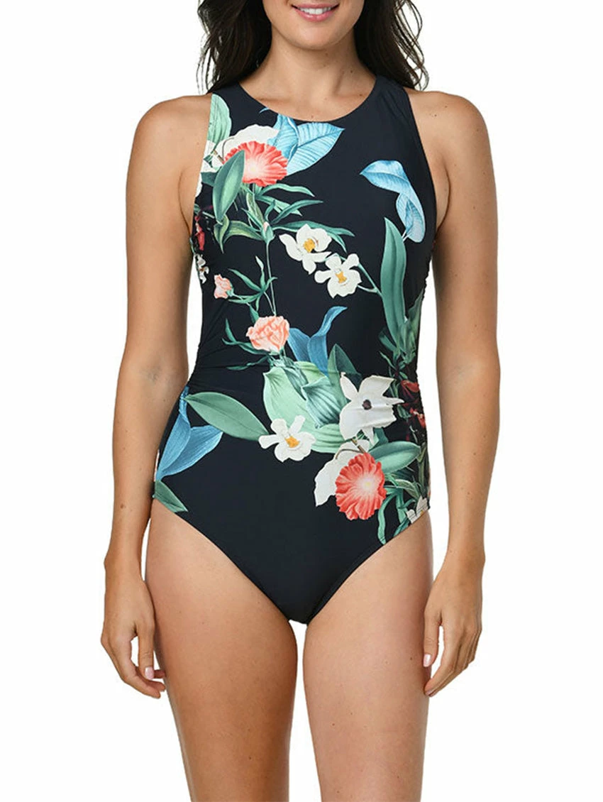 The Botanical Beauty Farrah High Neck One Piece from Jantzen features a high neck design for a classic look, while the beautiful portrait back gives a flirty vibe. This swimsuit also features sewn-in cups for shape and a comfortable tummy control to smooth and flatter every body.