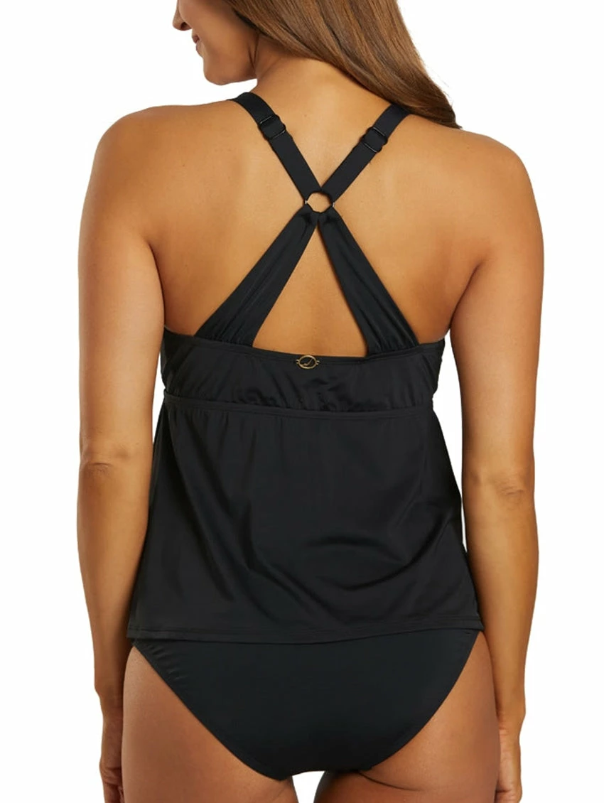 The Stella Tankini Top features a flattering V-neck front with an underwire, in classic black to easily match different bottoms. What are you waiting for? The perfect tankini is here!