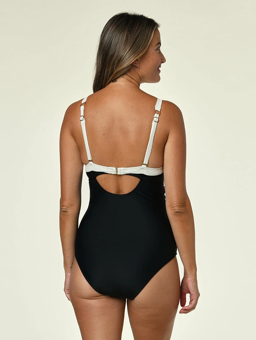 The Midnight Glam Debbie One Piece Swimsuit from Jantzen features a V neckline with removable cups and adjustable straps for that perfect fit. Topped off with tummy control for smoothing and shaping, this is going to become your favorite swimsuit.